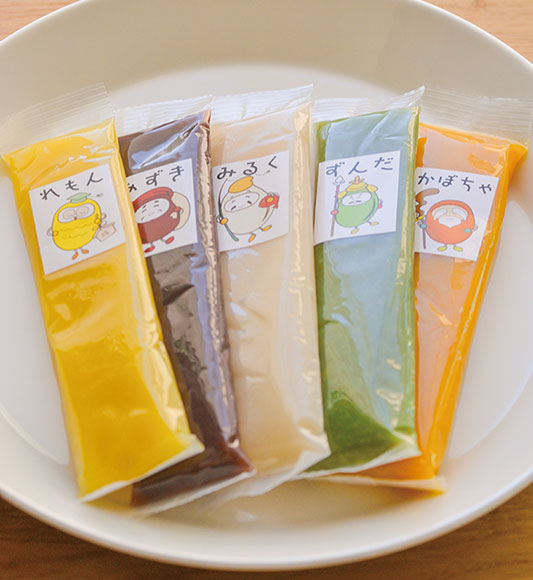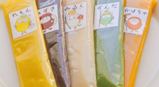 77年にわたってあんこを作り続ける福居製餡所には直売所があり、定番のあんこやようかん、甘納豆などを販売しています。最近登場したのが、スティック状のあんこ“口福(こうふく)ぼっこ”。小豆、抹茶のほか、かぼちゃやずんだ、レモンなど、現在7種類で年内にあと5種類増える予定です。パンに塗ったり、アイスにのせたりと楽しみ方はいろいろ。常温で保存できるので、登山の際の行動食にもよさそうです。