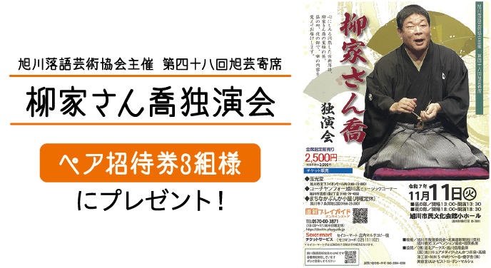 落語家・柳家さん喬さんの独演会が11月11日(火)に開催されます。1948年生まれ、東京都出身の柳家さんは人情噺(はなし)など古典の名手として知られる一方、「噺(はなし)家は死ぬまで修業。芸には頂上というものがない」をモットーに喜寿を迎えた現在も新作落語にも挑んでいます。北海道との縁も深く、現在も道北の数カ所で会を開いています。今回、ななかまど読者3組様に抽選でペア招待券をプレゼントします。下記応募要項をご参照の上、奮ってご応募ください。