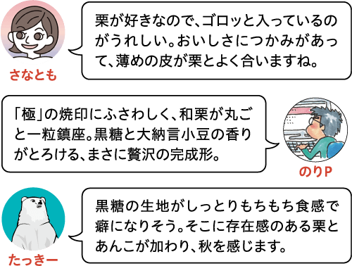 極軟に炊き上げた国産の和栗を丸ごと一粒贅沢に…。北海道産の大納言小豆を使ってじっくり丁寧に炊き上げた上質なあじわいの粒餡。しっとりもっちり黒糖の風味をいかした焼皮。北倶楽部としての、贅を尽くしたどら焼きです。