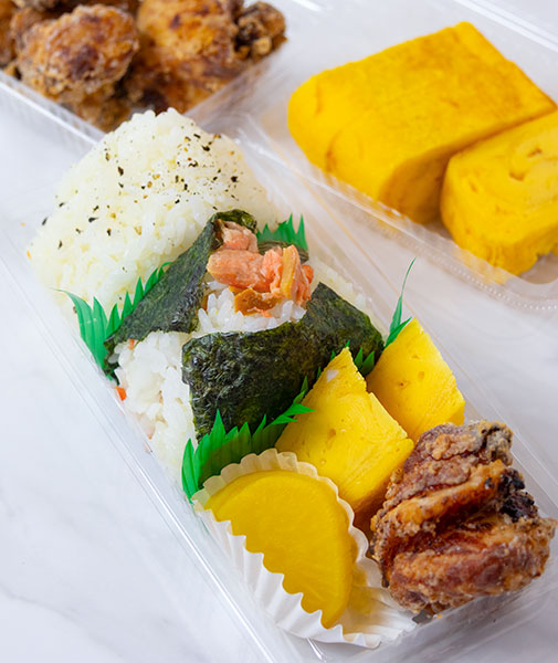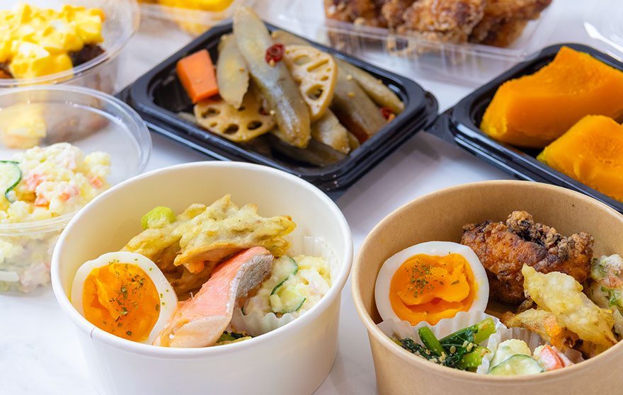 惣菜は人気のたまご焼きやザンギの他、きんぴら、チキン南蛮など単品からお得なセットまで揃っている