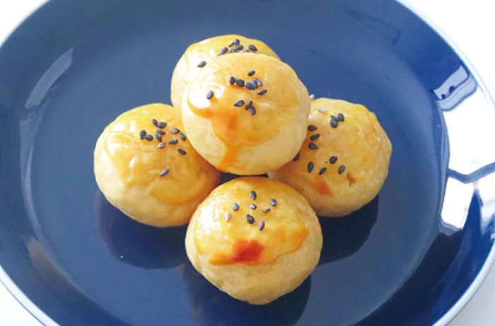 ❺アルミホイルを敷いた天板に④を並べ、表面に指で卵黄を塗ります。黒ごまをのせ、焼き色がつくまでオーブントースターで5分程焼きます。