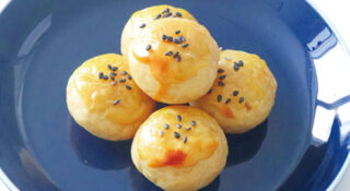 ❺アルミホイルを敷いた天板に④を並べ、表面に指で卵黄を塗ります。黒ごまをのせ、焼き色がつくまでオーブントースターで5分程焼きます。