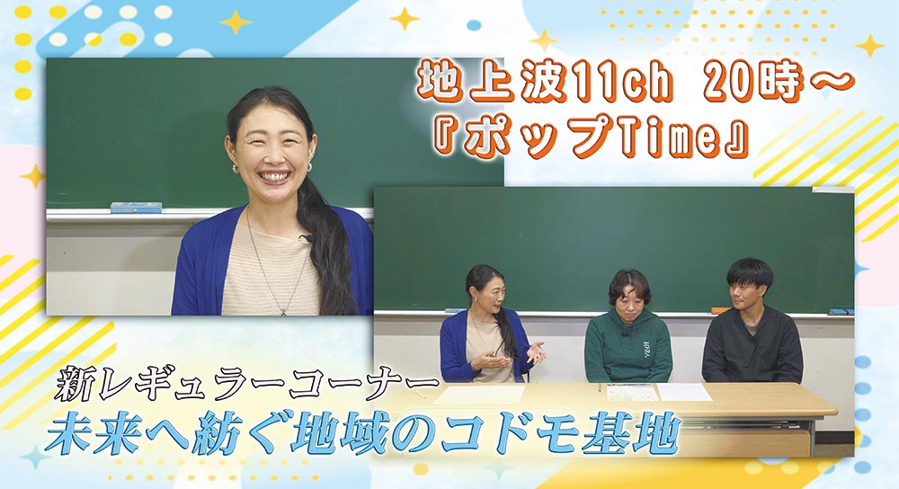 リポーターを務めるのは、春光台地区で子ども食堂を運営する「ふくふく家族の会」代表で、社会教育士の福屋聖恵さん。子ども食堂や遊び場、学びの場など、子どもの居場所づくりを提供する団体を訪ね、団体の特徴や設立のきっかけ、活動を続ける想いをお聞きしています。地域が支え合い、あたたかな輪を広げる「未来へ紡ぐ 地域のコドモ基地」は、「ポップTime」で放送中です。