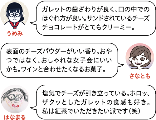 香り豊かなフランス産小麦と香ばしいアーモンドパウダーを使用し、ホロホロとした食感のガレットを焼き上げ、北海道チェダーチーズパウダーとホワイトチョコレートをベースにした濃厚なチーズチョコレートを重ね合わせました。ガレットとチーズチョコレートの風味が織りなす繊細で豊かなハーモニーをご堪能ください。