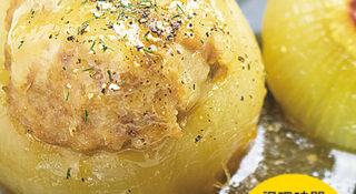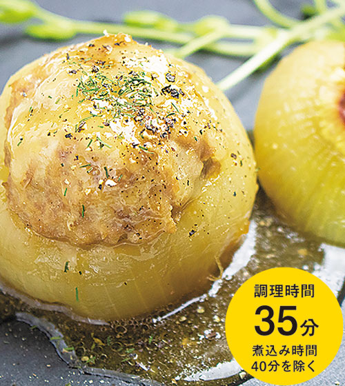 ❺②のくりぬいた玉ねぎに④をつめていき、鍋に並べる。だしと旨つゆを注ぎ、玉ねぎがやわらかくなるまでコトコト煮る。