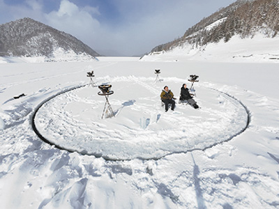 回転する氷の円盤の上で、氷結したダム湖を360度パノラマ体験。