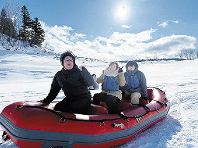 スノーモービルに引かれたラフトボートに乗車。スリリングなスピードと横滑りは、北国ならではの体験!