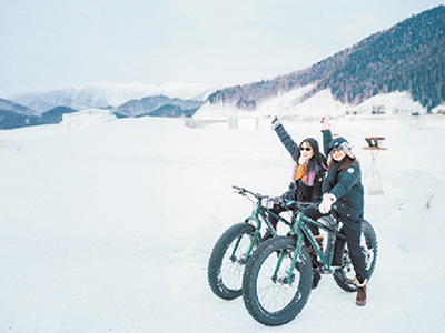 雪上でもガンガン走れる、極太タイヤのファットバイクや、広い雪原をのんびり散策できるスノーシューをご用意。