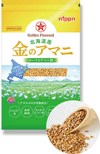 北海道産「金のアマニ」。オメガ3脂肪酸、たんぱく質、食物繊維、アマニリグナンなどを豊富に含む