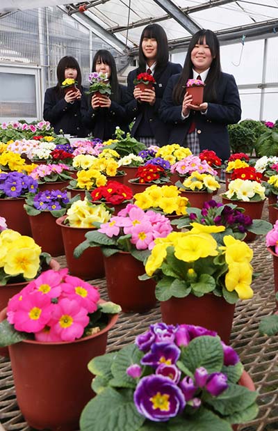 温室は一足早い春の色*旭農高 プリムラ開花*31日に販売会