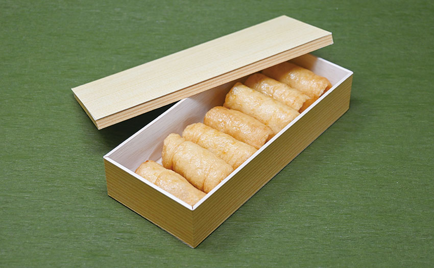 「をいなりの折り詰め(7個入1,200円)」は、ひと口ごとに優しい味わいのだしがしみ出てくる