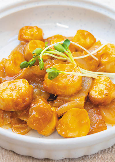 ①こんにゃくは薄く切り、裾に切り込みを数カ所入れる。エリンギは1.5cmの輪切りにし、片栗粉をまぶしておく。