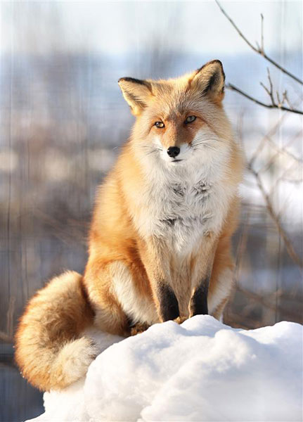 【写真説明】雪山の上で来園者を見つめるキタキツネ「なる」(熊谷洸太撮影)