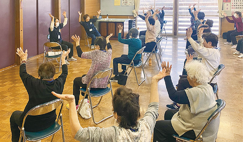 「あさひかわリハビリ体操指導士」が講師となり、健康づくりのための体操を行っています。ストレッチ、筋トレ、バランスの3分野に分け、伸ばしたり、ひねったりとそれぞれ無理のない範囲で体を動かします。「フライパンを持つ動作ですよ」「お風呂で背中を洗う感じ」など、毎日の暮らしにつながる動きや体の仕組みについて丁寧に紹介。体の弱い方でも参加でき、いつまでも通い続けられるサークルです。「みんなから元気をもらっている」という声もあり、生き生きとした笑顔にたくさん出会えました。