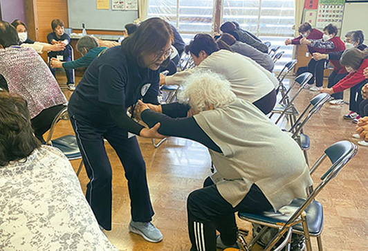 「あさひかわリハビリ体操指導士」が講師となり、健康づくりのための体操を行っています。ストレッチ、筋トレ、バランスの3分野に分け、伸ばしたり、ひねったりとそれぞれ無理のない範囲で体を動かします。「フライパンを持つ動作ですよ」「お風呂で背中を洗う感じ」など、毎日の暮らしにつながる動きや体の仕組みについて丁寧に紹介。体の弱い方でも参加でき、いつまでも通い続けられるサークルです。「みんなから元気をもらっている」という声もあり、生き生きとした笑顔にたくさん出会えました。