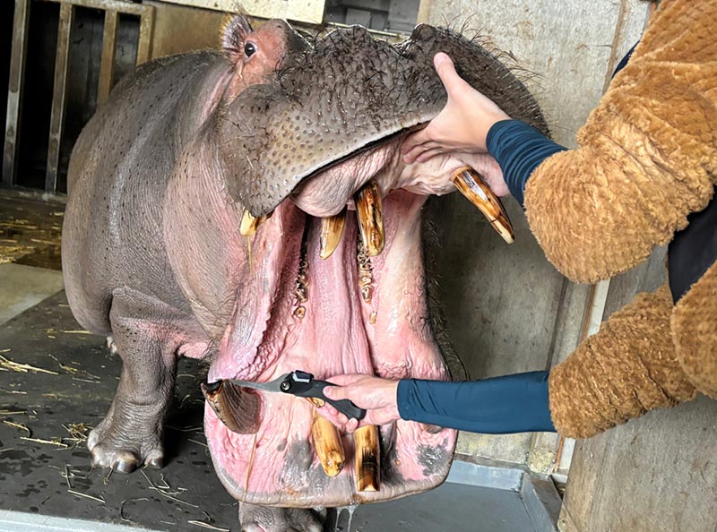 【写真説明】口を開けたまま歯を切らせてくれるカバ