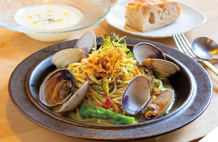 菜の花のジェノベーゼソースの上品な味わいの奥に、あさりやニンニクの風味があふれています。ゴボウの素揚げも香ばしく「こんなパスタが食べたかった」と叫びそう。豆と野菜のチョルバスープとフォカッチャが付いていますが、220円プラスで新玉ねぎのポタージュに変更可能。3月中旬までの限定メニュー。
