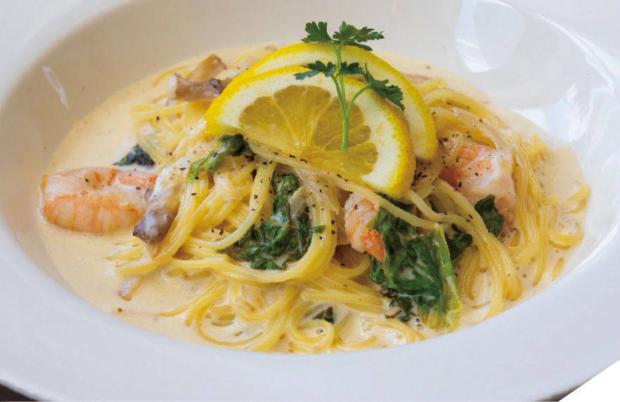 フレッシュなレモンの酸味とまろやかな生クリームが相性抜群で、女性客に一番人気のメニューです。歯触りの良い海老や舞茸がいいアクセントに。プラス100円でサラダ付きに、プラス200円でグルテンフリーパスタに変更できます。平日限定の“おしゃべりランチセット(サラダ、デザート、ドリンク付¥2,000)”もお薦めです。