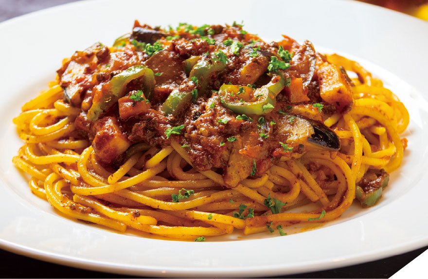 看板メニュー“ミートソース”をベースに、ナスやピーマン、ベーコンをプラスした満足感のある夜限定メニューです。ニンニク生産量日本一の青森県産“たっこにんにく”や、イタリアバリラ社のパスタ“セレシオーネ・オロ・シェフ”など、素材へのこだわりがおいしさの後押しをしています。熱々でできたてのおいしさを楽しんでください。