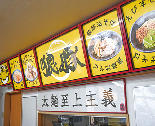 店内に掲げられた写真付きのメニュー。その下にある「太麺至上主義」の文字がこだわりを物語る