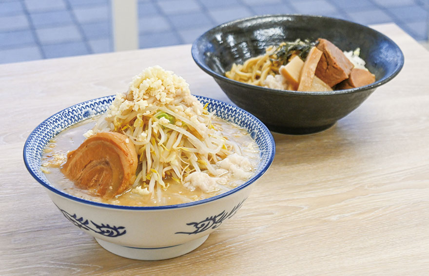 トッピングをすべてマシマシにした「狼豚ラーメン(左)」。かえしがよく絡む「油そば(850円)」もおすすめ