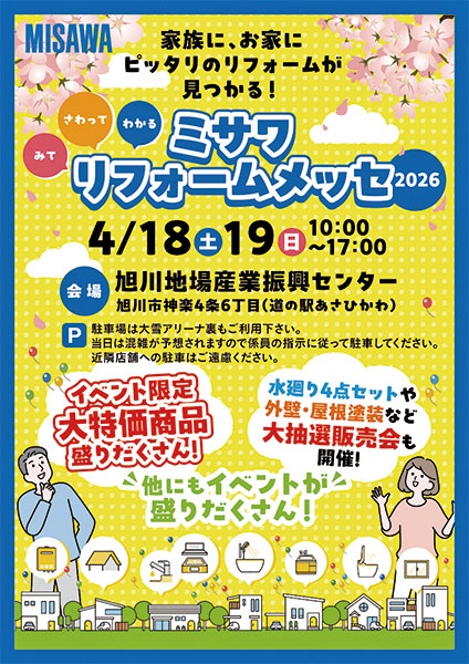ミサワホーム北海道旭川支店は、「みて、さわって、わかる ミサワリフォームメッセ2026」を4月18日(土)と19日(日)に「旭川地場産業振興センター(道の駅あさひかわ)」で開催します。お得なリフォーム商品や住宅設備商品の展示、家族みんなで楽しめるイベントなど盛りだくさんにご用意。家族にお家にピッタリのリフォームを提案します。皆さまのお越しをお待ちしています。