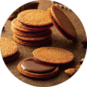 数種類のカカオを配合した深みのあるチョコレートのビターな味を、アーモンドガレットでサンドしました。1個210円