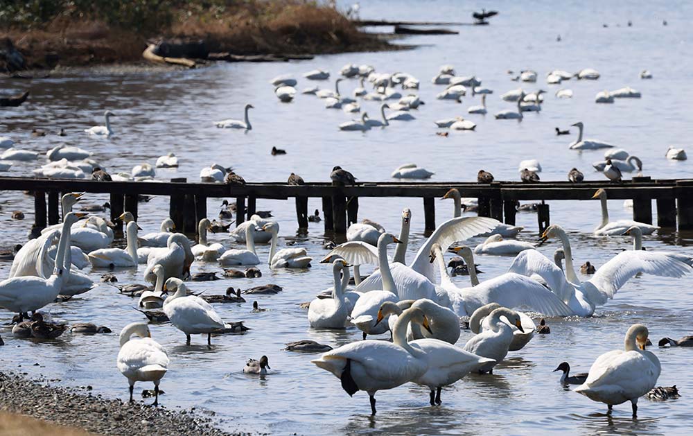 【浜頓別】本州の越冬地からロシア極東の繁殖地へ渡る中継地となっているクッチャロ湖で、長旅を前に羽休めするハクチョウの飛来がピークを迎えている。15日は今季最多の1万1535羽が集まった。
